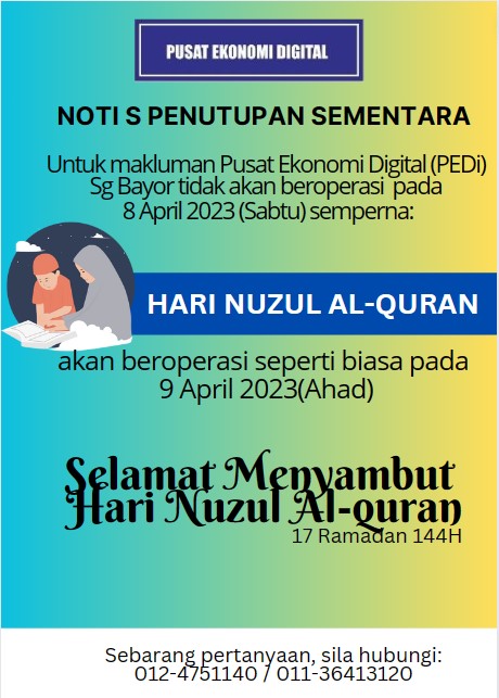 Penutupan Sementara Operasi Pusat Ekonomi Digital (PEDi) Pedi Sg Bayor pada 8 April 2023 kerana cuti umum Hari Nuzul Al-Quran.