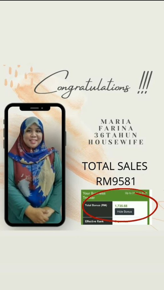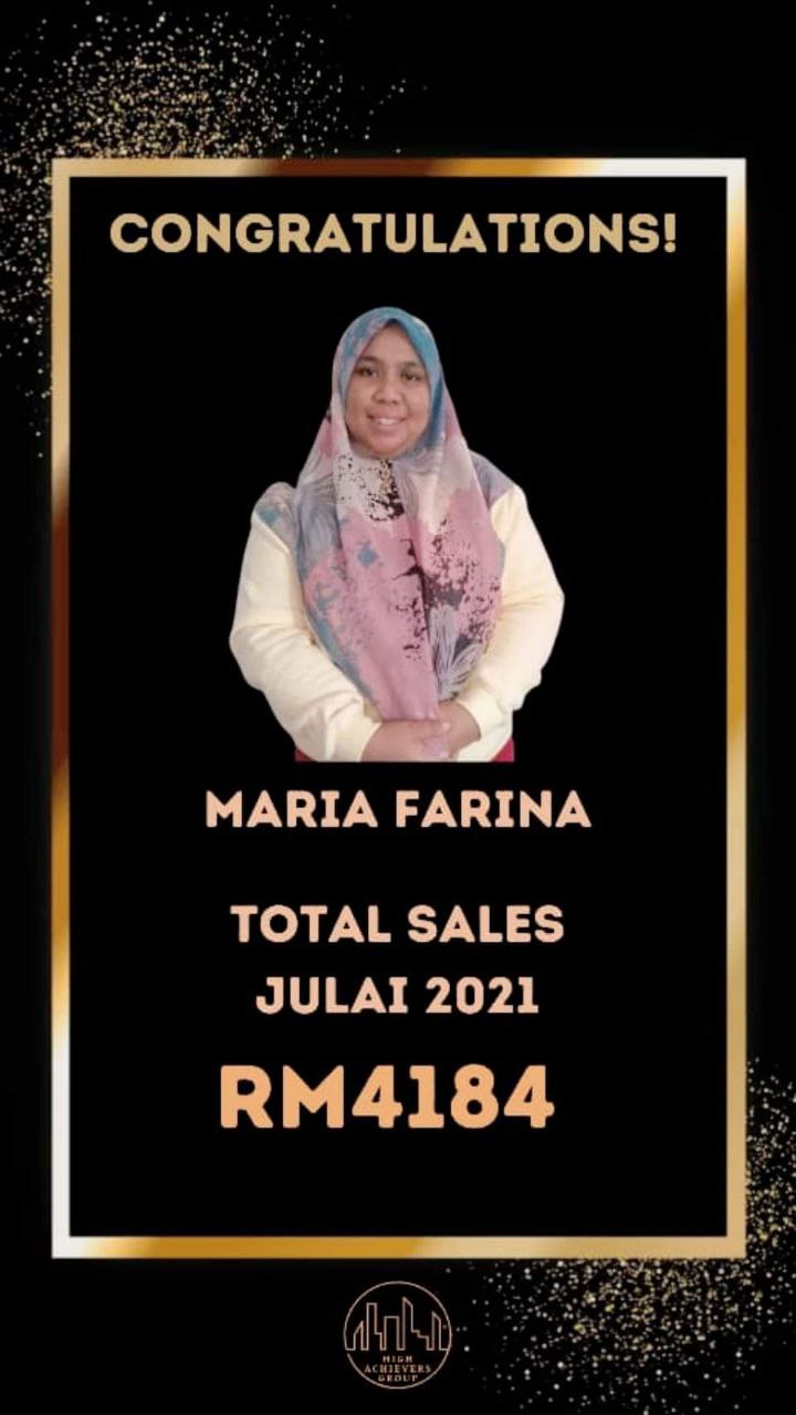 Puan Maria Farina merupakan seorang suri rumah sepenuh masa mengusahakan perniagan atas talian dengan menjual produk kesihatan. Penjualan dan pemasaran hanya di buat melalui kaedah online termasuk facebook dan instagram dan aplikasi terbaru yang dibangunkan oleh Pusat Internet 1Malaysia sendiri iaitu Dashboard PI1M.