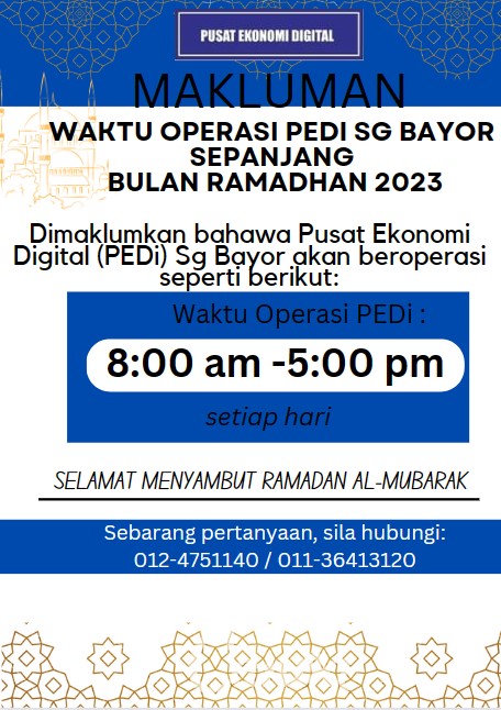 Waktu operasi Pusat Ekonomi Digital (PEDi) Pedi Sg Bayor sepanjang bulan Ramadan 2023 dari 23 Mac 2023 (Khamis) sehingga 21 April 2023 (Jumaat) beroperasi seperti biasa